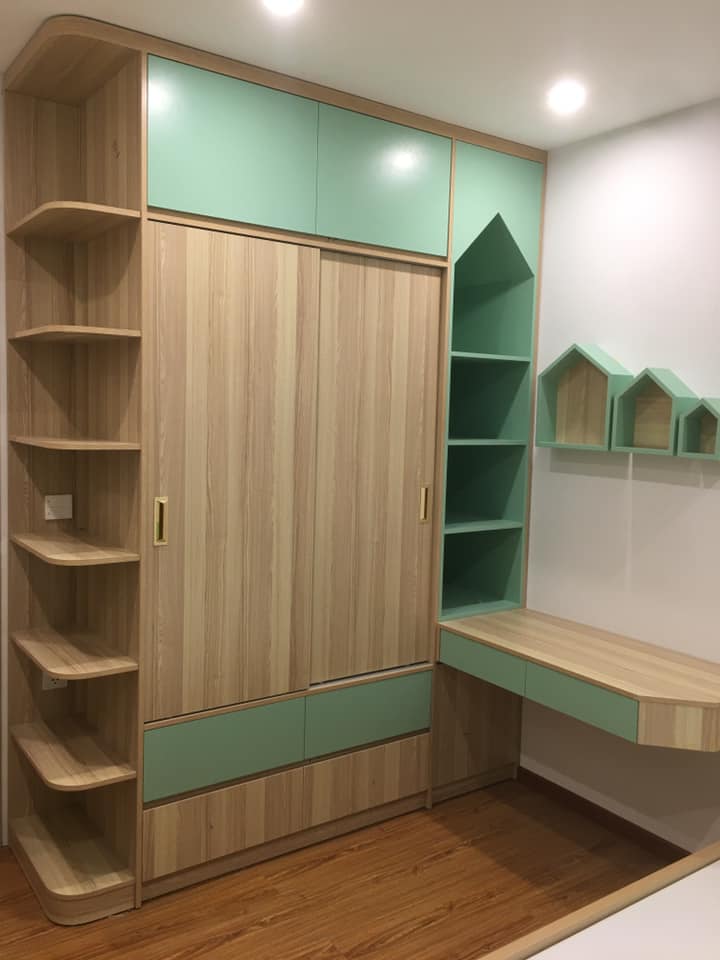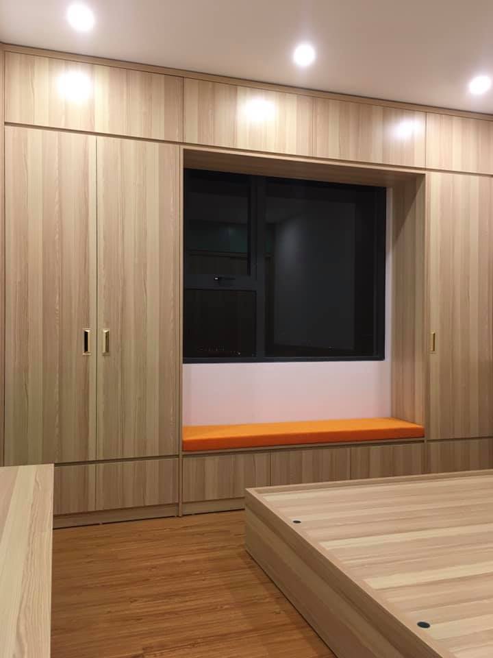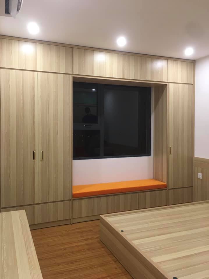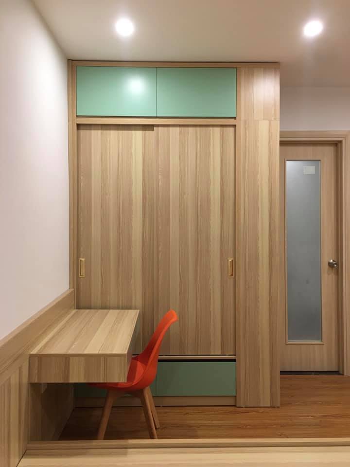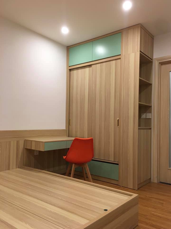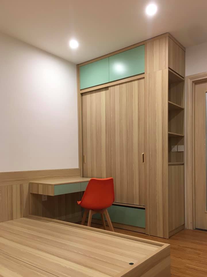 Phòng ngủ được bố trí khoa học với giường ngủ thông minh, tủ quần áo kịch trần và bàn trang điểm liền khối. Nhờ sử dụng gỗ công nghiệp nên tổng thể không gian trông gọn gàng, sạch sẽ và mang lại cảm giác hiện đại đặc trưng của năm 2025.