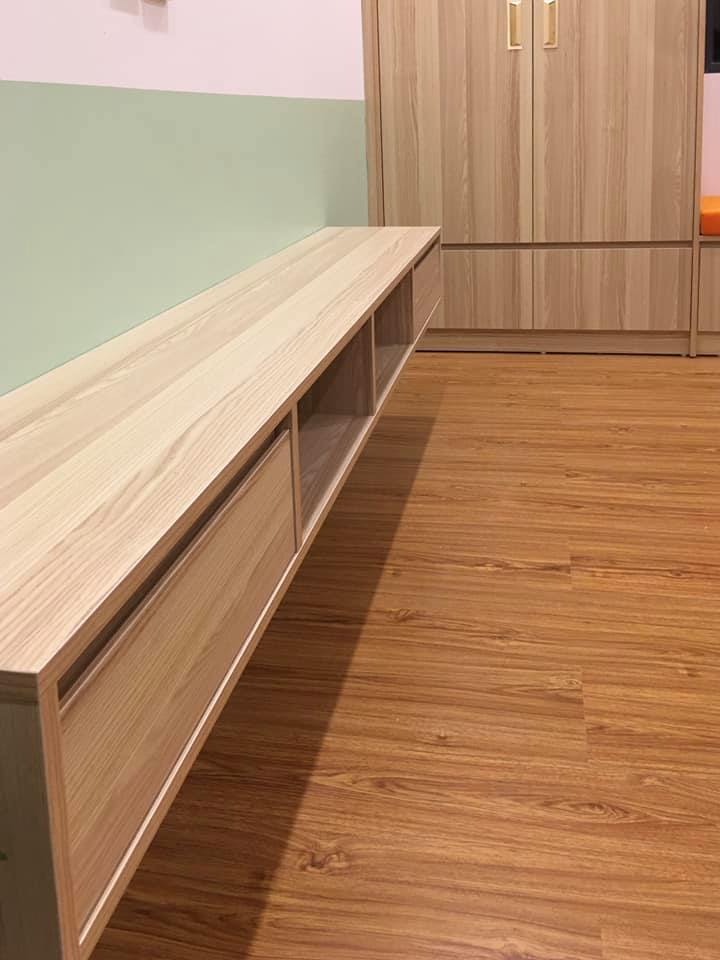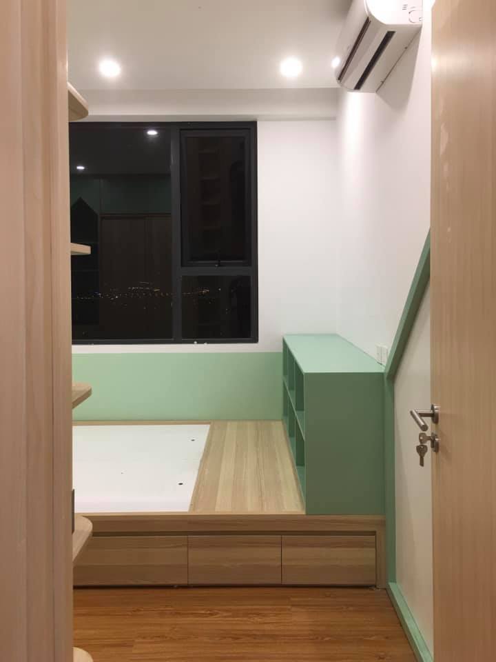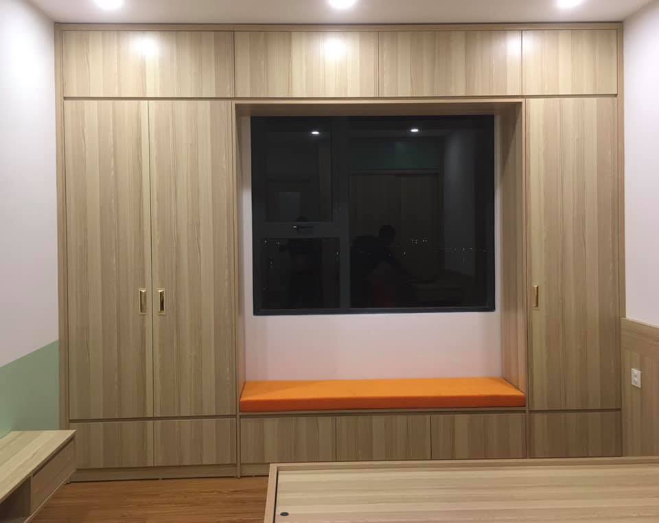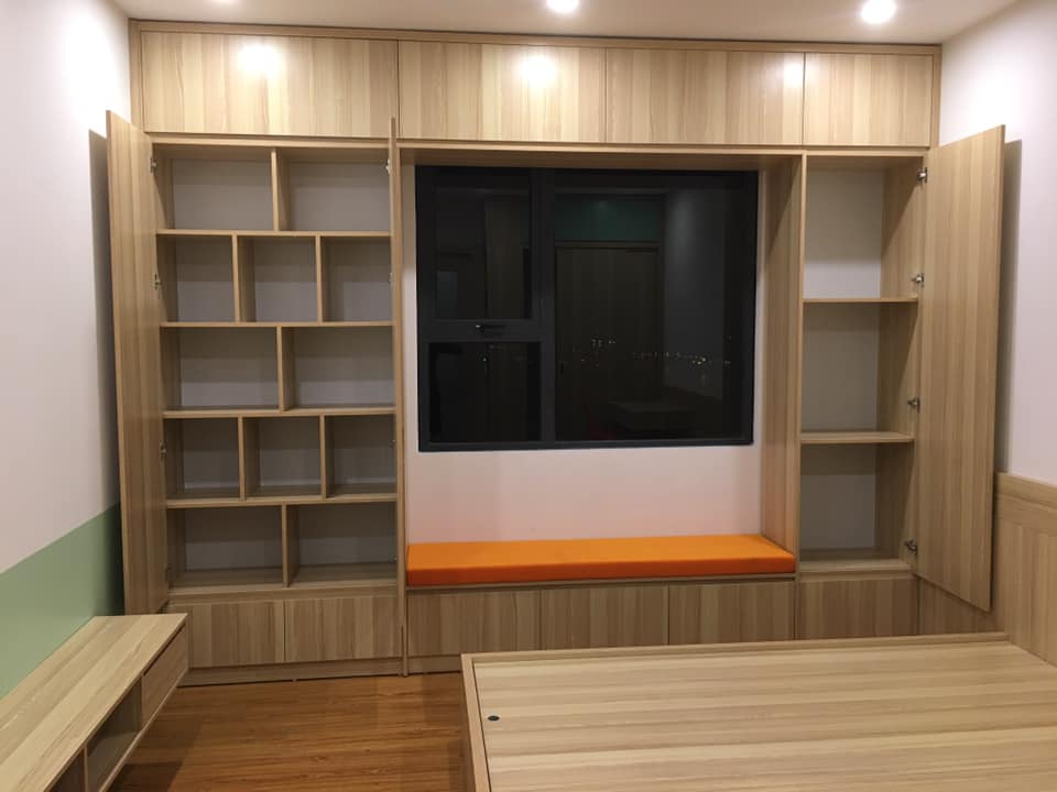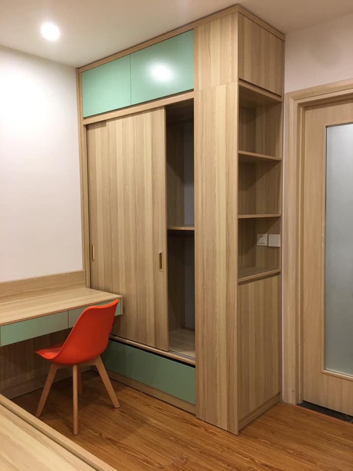 Phòng ngủ được bố trí khoa học với giường ngủ thông minh, tủ quần áo kịch trần và bàn trang điểm liền khối. Nhờ sử dụng gỗ công nghiệp nên tổng thể không gian trông gọn gàng, sạch sẽ và mang lại cảm giác hiện đại đặc trưng của năm 2025.