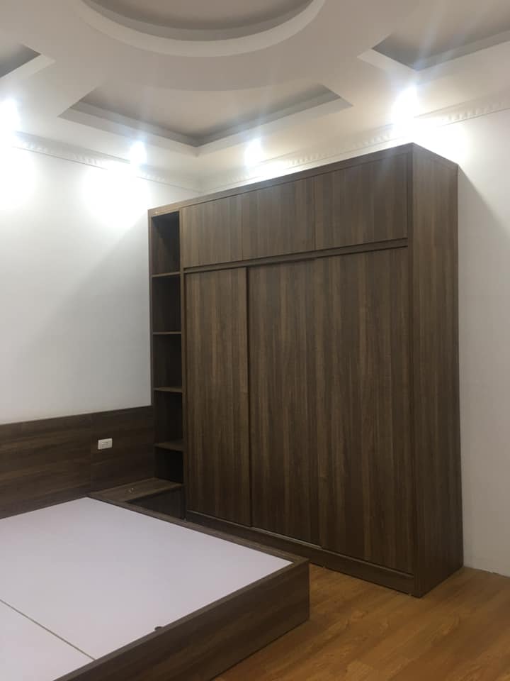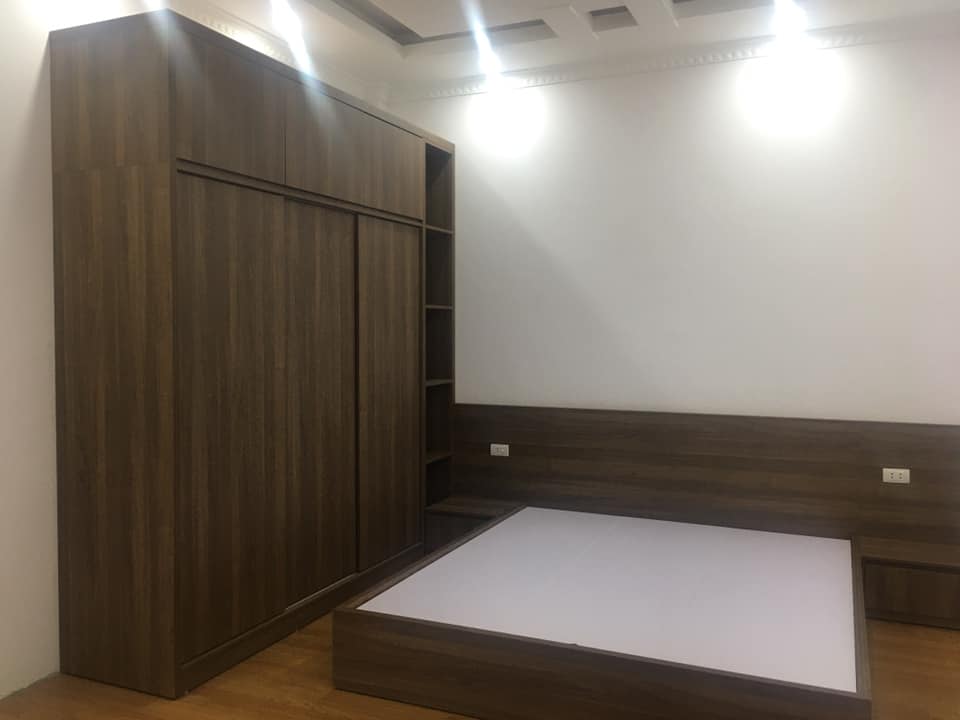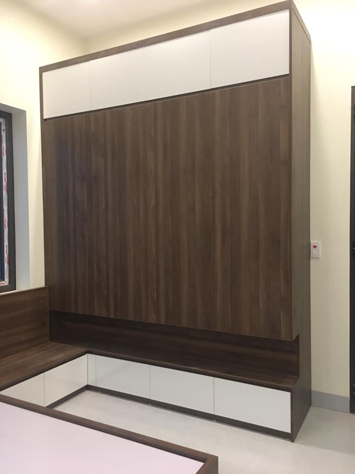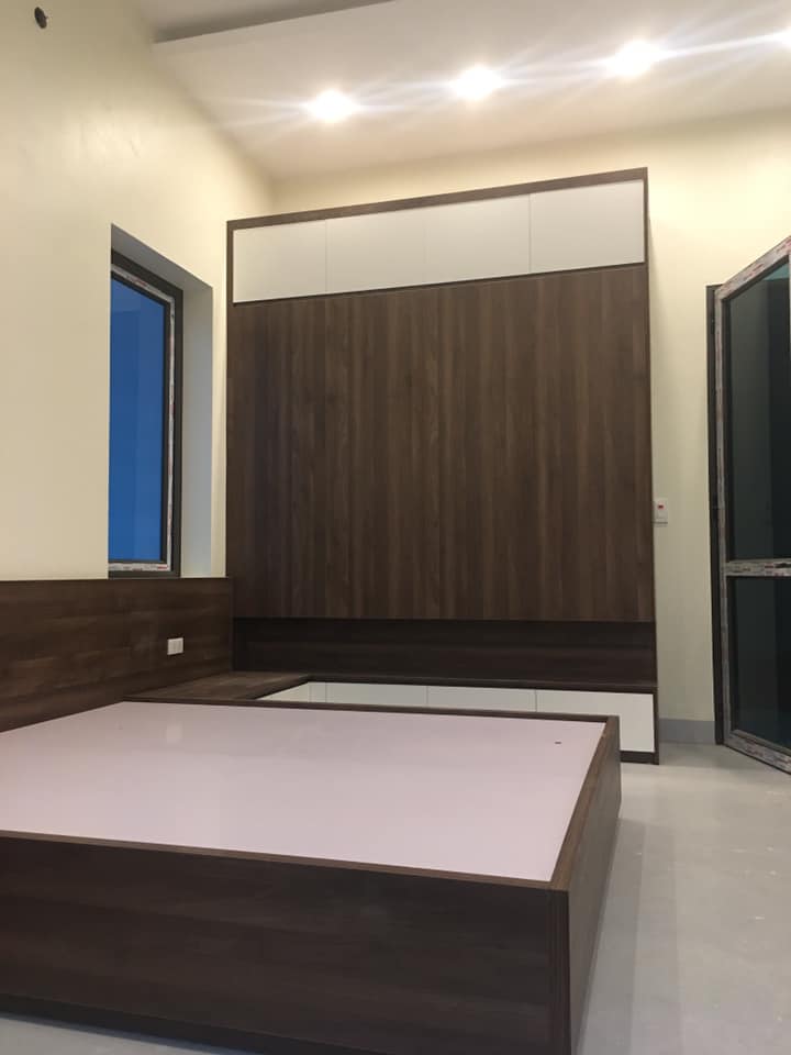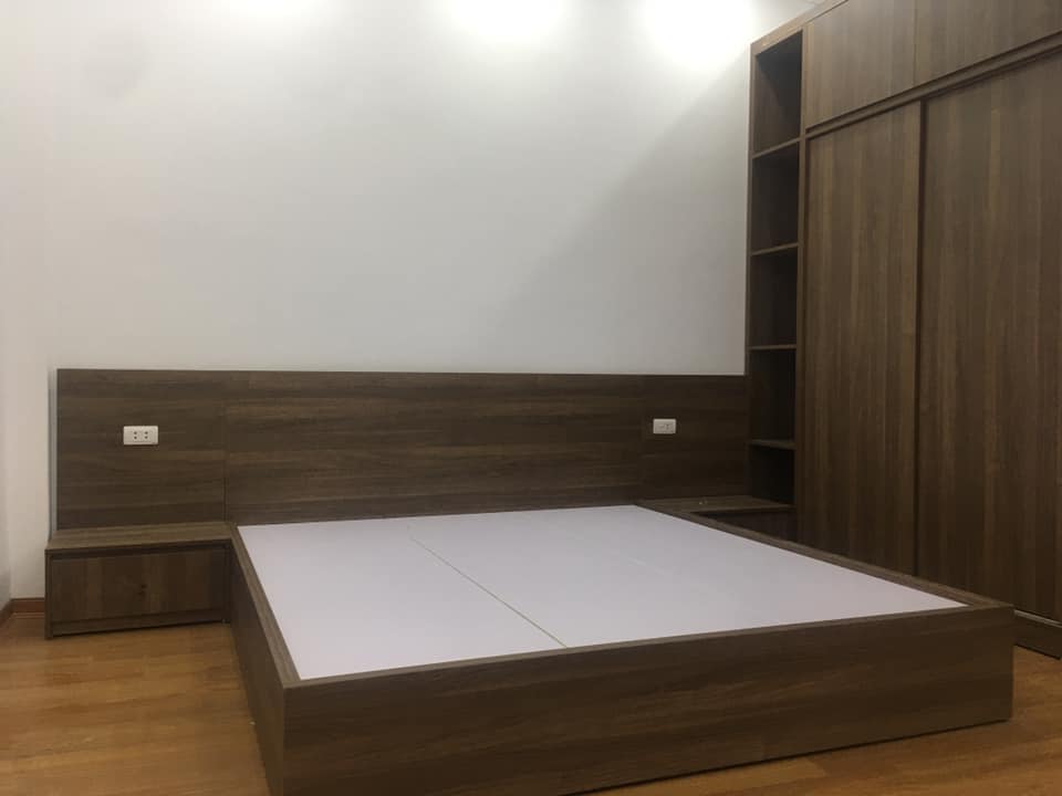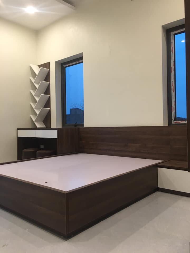 Phòng ngủ được bố trí khoa học với giường ngủ thông minh, tủ quần áo kịch trần và bàn trang điểm liền khối. Nhờ sử dụng gỗ công nghiệp nên tổng thể không gian trông gọn gàng, sạch sẽ và mang lại cảm giác hiện đại đặc trưng của năm 2025.