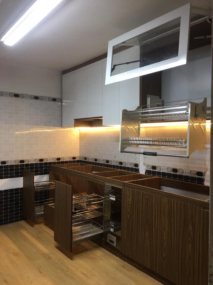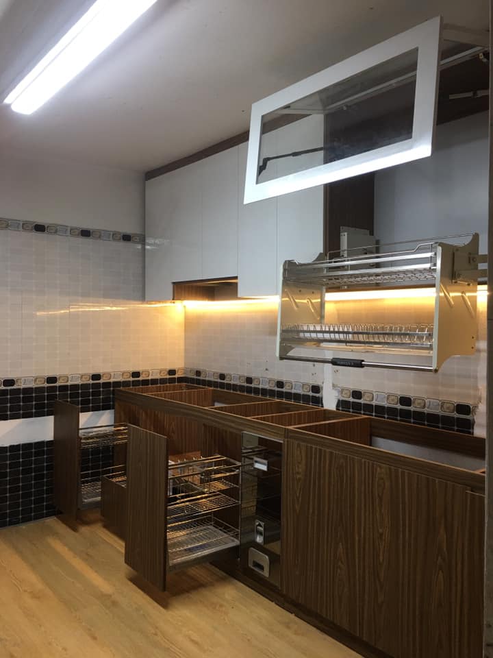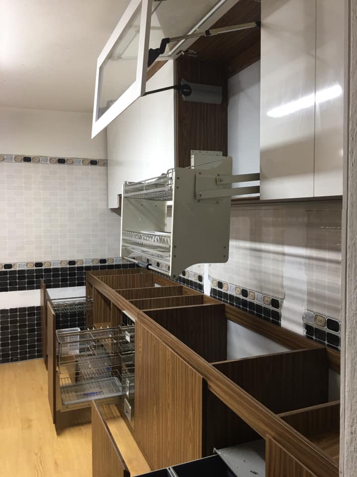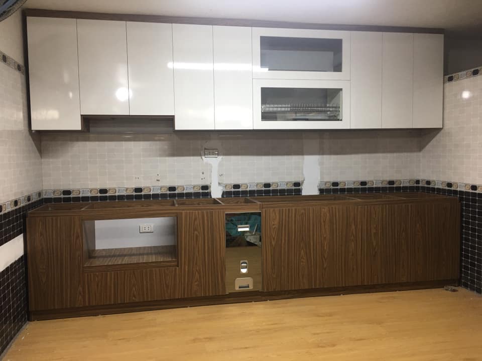 Khu vực bếp sử dụng hệ tủ bếp chữ I hoặc chữ L, tối ưu lối đi và tăng diện tích lưu trữ. Chúng tôi sử dụng thùng MDF chống ẩm – cánh Melamine hoặc Acrylic, kết hợp ray – bản lề giảm chấn giúp quá trình sử dụng luôn êm ái. Đặc biệt, mặt bếp được thi công đá thạch anh sáng màu giúp không gian rộng rãi và dễ vệ sinh hơn.